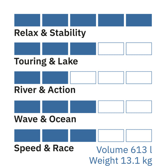 Prelaminated/Fusion Double Layer: Beim Prelaminated Double Layer wird während der Produktion des Grundmaterials direkt eine zweite PVC-Schicht aufgeschweisst. Dieses moderne Verfahren macht das SUP nicht nur robuster, sondern es können auch bis zu 25% Gewicht gegenüber einem herkömmlichen Double Layer SUP eingespart werden.